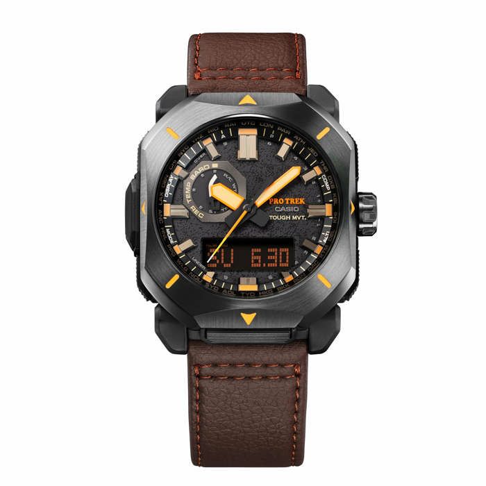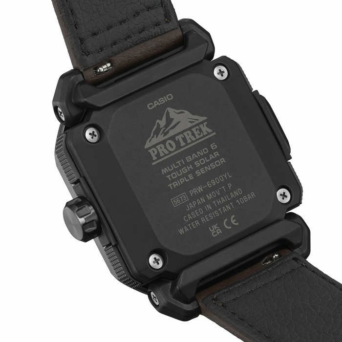 自然を愛する人の本格アウトドアギア PRO TREK から、環境 に配慮されたエコ素材を採用した、電波ソーラー搭載の PRW6900YとPRW-6900YL のご紹介です。 PRW-6900 では、荒々しいアウトドアスタイルをデザインテーマに 定め、武骨な薪割りの斧をイメージした、側面を削ぎ落としたシャー プな形状のメタルベゼルを採用しています。またベゼルだけでなく、 10 時位置にあるインダイアルの針も、アウトドアツールのナイフを イメージした鋭角的なデザイン形状にしています。秒針には揺れる 炎をイメージさせるオレンジグラデーションを配色。文字板には、ダッ チオーブンのような鋳物の表面を想起させる凹凸感あるデザインが 入っています。 また、PRW-6900YL では、皮バンドに火の粉が掛かっても燃え 広がりにくい難燃素材を採用しているので、アウトドアスタイルテー マに相応しい仕様になっています。 PRW-6900Y のバンドは、環境に配慮したバイオマスプラスチッ ク素材のソフトウレタンバンドとなっています。 PRW-6900Y/6900YLとも、ケースと樹脂製の裏蓋にもバイオ マスプラスチックの素材を使用しています。 時計本来の機能として世界 6 局の電波を受信するマルチバンド6 やタフソーラーなど実用的な機能も兼ね備えます。様々なシーンで 対応する高い機能性と実用性を詰め込んだモデルです。