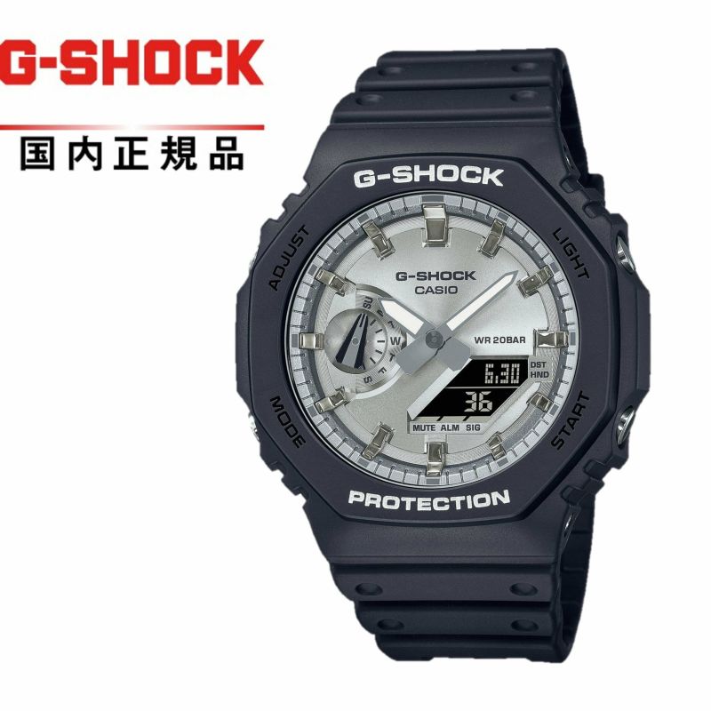 1983年の発売以来、飽くなき強さを求めて進化を続ける タフネスウオッチG-SHOCK。 八角形デザインが特徴的なGA-2100シリーズのカラー モデルです。 モデル全体を光沢感のあるブラックとマットな質感のブ ラックでそれぞれ統一し、フェイスに人気のゴールドとシ ルバーの蒸着文字板を採用。シックでファッションアイ テムとして活用できるデザインに仕上げました。 タフネスとデザイン性を両立した、幅広くご利用いただけ るクールなデザインとなっております。