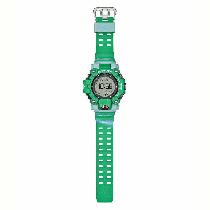 G-SHOCK/BABY-Gは、90年代後半より様々な環境団体とのコラボレーションモデルを制作し、団体のサポートを続けています。2023年も「LoveTheSeaAndTheEarth」というテーマのもと、絶滅の危機にある生態系、海洋・生物の多様性、気候変動など多岐にわたる環境保全、研究を支援しているEARTHWATCHをサポートしていきます。コラボレーションモデルには、MasterofGシリーズのMUDMAN(マッドマン)を採用し、森林破壊などにより絶滅が危惧されているヒロオビフィジーイグアナ※をモチーフにデザインしました。ヒロオビフィジーイグアナの特徴であるグリーンとブルーの体色をカラーの樹脂と全面プリントで大胆に表現。フロントボタンのステンレスパーツには、イグアナの瞳をイメージしてブラウンIPを施しています。「EARTHWATCH」の呼びかけの言葉である「ChangetheWorld.Yourself.」とEARTHWATCHのロゴマークをバンドと遊環に印刷。LEDバックライトにもロゴが浮かび上がり、裏蓋には「LoveTheSeaAndTheEarth」のシンボルマークを刻印するなど随所に細やかなデザインを施したモデルとなっています。また素材にはバイオマスプラスチックを採用し、蛍光灯などのわずかな光でも駆動するタフソーラーも搭載しています。パッケージには再生紙を使用した専用のボックスを採用しています。※南太平洋のフィジー諸島に生息。イグアナ科フィジーイグアナ属に分類される爬虫類