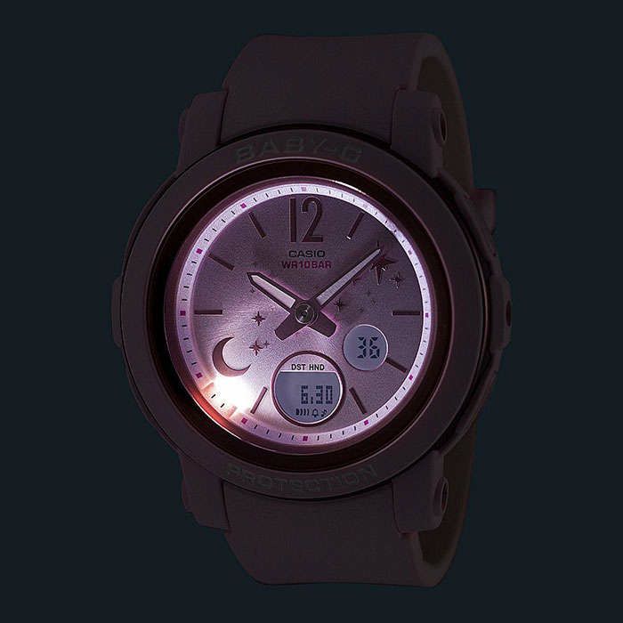 アクティブな女性のためのカジュアルウオッチBABY-Gから夜空に輝く月と星をテーマにしたウオッチです。
