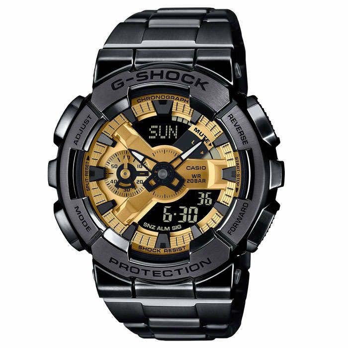 1983年の発売以来、究極の強さを求めて進化を続けるタフネスウオッチG-SHOCK。そのアイコニックなスタイルで人気モデルのひとつであるビッグケースのアナログ・デジタルコンビネーション、「110シリーズ」のベゼルとバンドを金属素材にアップデートしたGM-110です。