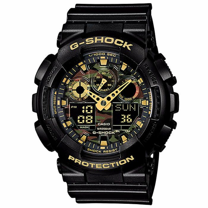 ベースモデルにはビッグケースが人気のGA-100を採用。ボディ、バンドはブラックをベースカラーに、インパクトのあるメタリックカモフラージュの文字板を組み合わせました。