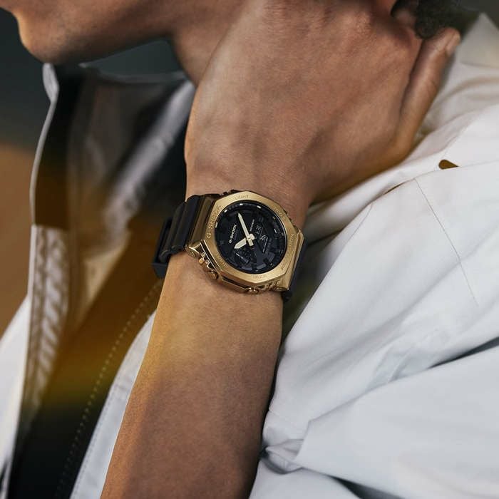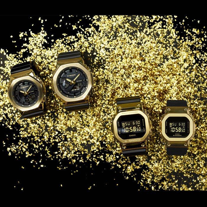 1983年の発売以来、飽くなき強さを求めて進化を続ける タフネスウオッチG-SHOCKから、メタルカバードシリー ズをベースに人気のブラックとゴールドカラーを採用した モデルです。 ブラックをベースにゴールドIPを施したメタルベゼルを採 用し、ゴージャスかつファッションアイテムとして、幅広く 活用できるデザインに仕上げました。 ブラック、ゴールドといった人気のカラーリングで、幅広いシー ンでご利用いただけるクールなデザインとなっております。