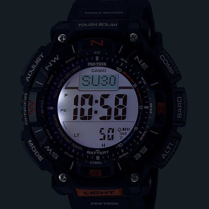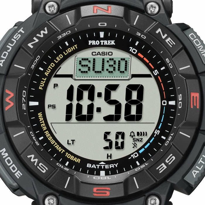●タフソーラー(ソーラー充電システム) ● 10 気圧防水機能 ●ワー ルドタイム:世界 48 都市(31 タイムゾーン、サマータイム設定機能 付き)+ UTC(協定世界時)の時刻表示 ●方位計測機能:16 方 位・方位の角度(0 ~ 359°)を計測、方位連続計測(60 秒)、東 西南北をグラフィック表示、ベアリングメモリー(方位の角度、記 録した方向を示すグラフィックを 1 本メモリー)、磁気偏角補正機 能、方位補正機能 ●気圧計測機能(計測範囲:260 ~ 1,100hPa)、 気圧傾向グラフ表示(過去 42 時間分を表示)、気圧差グラフィッ ク、気圧傾向インフォメーションアラーム(特徴的な気圧の変化が 起こった場合に矢印と報音でお知らせします) ●高度計測機能 / 相 対高度計(計測範囲:- 700 ~ 10,000 m)、高度メモリー(計測 月日・時刻・高度を最大 30 本マニュアルメモリー、自動記録デー タ:最高 / 最低高度、オート積算(上昇 / 下降)メモリー)、登山 記録データ 14 本(最高 / 最低高度、オート積算(上昇 / 下降)メ モリー)、高度差計測(- 3,000 ~ 3,000 m)、計測間隔設定機能(5 秒 /2 分毎)※最初の 3 分間のみ 1 秒毎 ●温度計測機能(計測範 囲:- 10 ~ 60℃) ●デュプレックス LC ディスプレイ ●日の出・ 日の入時刻表示 ●ストップウオッチ(1/10 秒、1000 時間計、スプ リット付き) ●タイマー(セット単位:1分、最大セット:24 時間、 1 秒単位で計測) ●時刻アラーム 5 本(1 本のみスヌーズ機能付 き)・時報 ●バッテリーインジケーター表示 ●パワーセービング 機能(暗所では一定時間が経過すると表示を消して節電します) ●フルオートカレンダー ● 12/24 時間制表示切替 ●耐低温仕 様(- 10℃) ●操作音 ON/OFF 切替機能 ● LED バックライト(フ ルオートライト、スーパーイルミネーター、残照機能、残照時間切 替(1.5 秒 /3 秒)付き) ●フル充電時からソーラー発電無しの状態での駆動時間 機能使用の場合:約 7ヵ月 パワーセービング状態の場合:約 27ヵ月 ※高度計は気圧変化を高度に変換する相対高度計です。気圧が気象 条件により変化すると、計測値の高度も変化します。 ※外気温を計測するときは、時計を腕から外して、体温、汗(水滴)、直射 日光などの影響を受けないようにしてください。