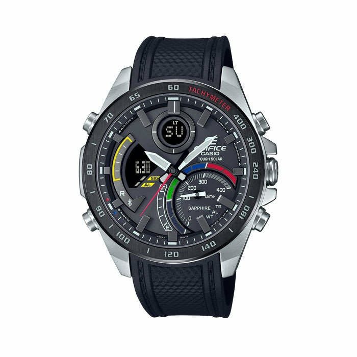 EDIFICEスマートフォンリンクシリーズのデジタル・アナログコンビモデルECB-950/900シリーズに、レーシングカーのステアリングにインスパイアされたスポーティなカラーリングを施しました。レーシングカーのステアリングはレース中にも正しく操作できるよう各スイッチを色分けしています。その発想を秒針やインダイアルのインジケーターに応用し視認性を高めました。