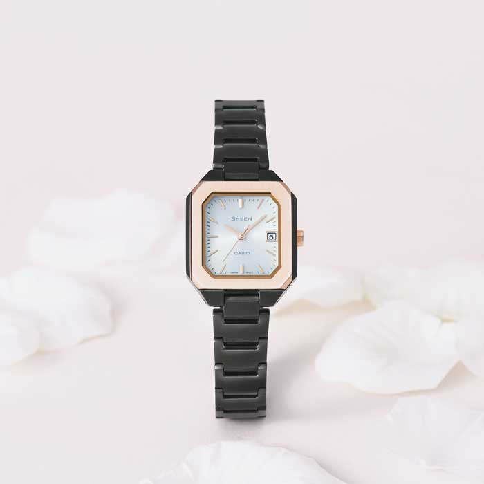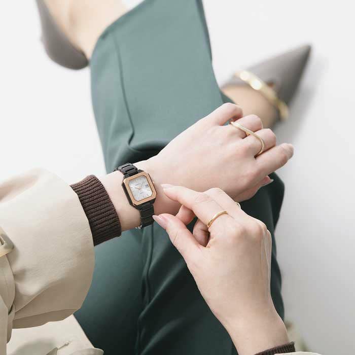 エレガントとクールが融合した新型モデルです。 ブラック×ピンクゴールド、ダークグレー、シルバーの3タイプをご 用意。 ベゼルはヘアライン仕上げ、ケース側面はミラーで仕上げることで マニッシュな印象に。 電池交換の手間が軽減するソーラー充電システムや日付表示機 能を搭載。また、傷付きにくい高硬度の反射防止コーティングサ ファイアガラス、5気圧防水機能も採用しています。