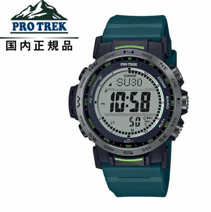 自然を愛する人の本格アウトドアギアPRO TREKクライマーライ ンから、環境に配慮されたエコ素材を採用し、直感的な操作が可 能なデジタルモデルのPRW-35のご紹介です。 バンドは、環境に配慮したバイオマスプラスチック素材のソフトウレ タンバンドとなっています。ケースと樹脂製の裏蓋にもバイオマス プラスチックを使用し、軽量化を図りました。 また、蒸れを防ぐスリット穴を設け腕への装着性を向上しました。 時計右側に方位、気圧/温度、高度をワンプッシュで計測できる 大型のダイレクトボタンを配し、計測結果を数値でデジタル表示。 各ボタンの近くに、瞬時に機能を認識できるよう方位・気圧・高 度を示す機能表記を採用し、過酷なアウトドアシーンにおいても、 直感的に必要な情報を計測、把握できます。また、STN液晶や ボールドフォントを採用し視認性を向上させています。 計測機能に加えタフソーラーや電波受信機能、10気圧防水等 の基本性能も搭載し、過酷なシーンでも使用できます。