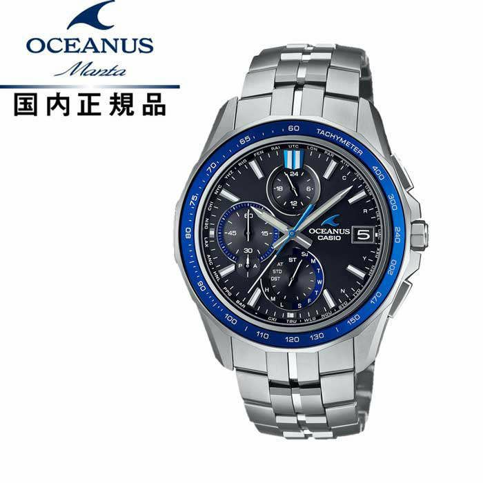 “Elegance,Technology”をブランドコンセプトに、上質な仕 上げと薄く美しいフォルムを追求しているOCEANUS Manta (マンタ )より、流 麗かつスポーティなフォルムに 仕 上げた OCW-S7000です。 両面反射防止コーティングを施したデュアルカーブのサファイアガ ラス、斜面のついたケースとベゼル、12時側から6時側にかけて 大きくミラー面が入ったケース、斜面がついた立体的な造形の4 本足のスポーティなラグ、これらの要因により、ケースからバンドに かけて流麗なフォルムを引き立てて、伸びやかな印象のデザインと なっています。 ベゼルにはリング状に加工したサファイアガラスを配し、サファイア ガラスの裏面をブルー/ライトブルー蒸着で着色。見る場所や角 度で表情が変わっていく、美しい青の輝きをお楽しみいただけます。 また、タキメーターを配し、クロノグラフらしいスポーティなデザイン に仕上げています。 OCW-S7000BとS7000Aの文字板には、ブルーからブラック に変化するグラデーション蒸着を施しています。加えて、OCWS7000BのバンドとケースにはDLC処理を施し、力強い印象を与 えています。 機能面では標準電波受信機能による時計単体での時刻修正に 加え、Bluetooth? を利用したスマートフォンリンクによる時刻修 正機能を搭載。ワールドタイムの時刻を約300都市から簡単に設 定したり、自動でタイムゾーンやサマータイムの変更に対応できま す。これらの高機能を厚さ9.5mmのスリムケースに収め薄く美し いフォルムも実現。 機能性とデザイン性を兼ね備えた上質なOCEANUS Mantaです。