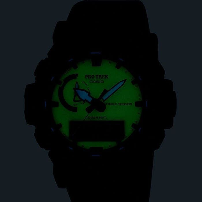 自然を愛する人の本格アウトドアギアPRO TREKクライマーライ ンから、PRW-61LDのご紹介です。 ケースおよびバンドと樹脂製の裏蓋には環境負荷の低減が期待 されるバイオマスプラスチック樹脂を採用、環境への配慮を形に しました。 PRW-61LDは、夜間のアウトドアシーンでの実用性向上のため、 全面蓄光文字板を採用しました。 文字板のインデックスやバンドにダークコヨーテカラーを採用し、 アウトドアにふさわしいカラーとしています。 トリプルセンサーが搭載されているので、方位、高度/気圧、温度 を計測できます。 計測機能に加え、時計本来の機能として世界6局の電波を受信 するマルチバンド6やタフソーラーなど実用的な機能も兼ね備えます。夜間の視認性を高めキャンプなどの様々なシーンで対応す る高い機能性と実用性を詰め込んだモデルです。