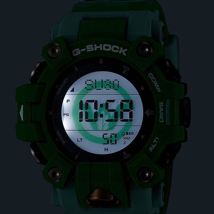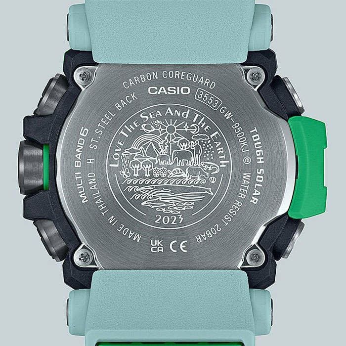 G-SHOCK/BABY-Gは、90年代後半より様々な環境団体とのコラボレーションモデルを制作し、団体のサポートを続けています。2023年も「LoveTheSeaAndTheEarth」というテーマのもと、絶滅の危機にある生態系、海洋・生物の多様性、気候変動など多岐にわたる環境保全、研究を支援しているEARTHWATCHをサポートしていきます。コラボレーションモデルには、MasterofGシリーズのMUDMAN(マッドマン)を採用し、森林破壊などにより絶滅が危惧されているヒロオビフィジーイグアナ※をモチーフにデザインしました。ヒロオビフィジーイグアナの特徴であるグリーンとブルーの体色をカラーの樹脂と全面プリントで大胆に表現。フロントボタンのステンレスパーツには、イグアナの瞳をイメージしてブラウンIPを施しています。「EARTHWATCH」の呼びかけの言葉である「ChangetheWorld.Yourself.」とEARTHWATCHのロゴマークをバンドと遊環に印刷。LEDバックライトにもロゴが浮かび上がり、裏蓋には「LoveTheSeaAndTheEarth」のシンボルマークを刻印するなど随所に細やかなデザインを施したモデルとなっています。また素材にはバイオマスプラスチックを採用し、蛍光灯などのわずかな光でも駆動するタフソーラーも搭載しています。パッケージには再生紙を使用した専用のボックスを採用しています。※南太平洋のフィジー諸島に生息。イグアナ科フィジーイグアナ属に分類される爬虫類