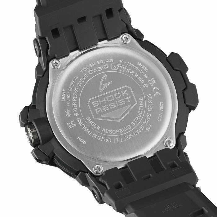 GRAVITYMASTER GR-B300ECは、次世代航空機から着想を得た有機的なフォルムを、シームレスな外装デザインで表現。カーボンコアガード構造や3Dワイドフェイスで、耐久性、視認性、装着性を追求。2都市の時刻を同時表示するデュアルタイムや、移動履歴を管理できるフライトログ、Bluetooth搭載電波ソーラーなどの実用的な機能も搭載しています。