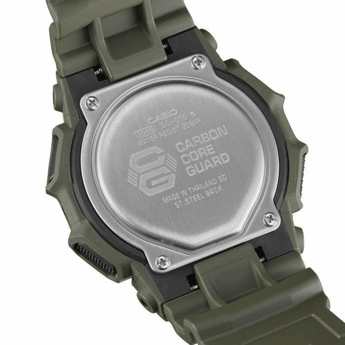 1983年の発売以来、飽くなき強さを求めて進化を続ける タフネスウオッチG-SHOCKから、10年バッテリーの新 定番モデルです。 ワイドフェイスとビッグケースで、10年バッテリーを搭載 したデジタルモデルのGD-010とデジタルアナログコン ビモデルのGA-010は、ワールドタイム、ストップウオッ チといった基本機能をはじめ、大型フロントボタンで操作 しやすいスーパーイルミネーターにより暗闇での視認性 も確保します。 バイオマスプラスチックやロングライフバッテリーにより、 環境にも配慮したモデルです。ケース素材に、軽量なが ら樹脂の概念を超える高剛性を発揮するカーボンファイ バー強化樹脂入りファインレジンを使用。衝撃による破 損、変形を防ぐことで、内部に配置したモジュールを保護 します。 各モデルともベースカラーのブラックに加えて、ワークス タイルにも合わせやすいカーキ、オレンジ、ブルーグリー ン、ベージュといったカラーを展開。 センターケース・ベゼル・バンドにバイオマスプラスチッ クを使用。 カジュアルスタイルからワークスタイルまでアクセントに なるクールなデザインです。