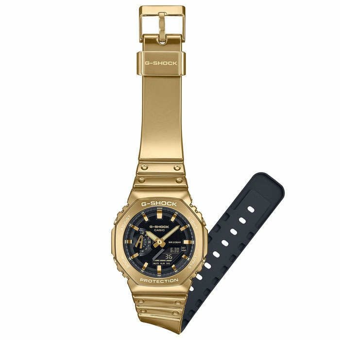 1983年の発売以来、飽くなき強さを求めて進化を続けるタフネスウオッチG-SHOCKから、シルバーとゴールドのワントーンでまとめた、FINE METALLIC SERIESです。ベースモデルには、アイコニックスタイルの定番デジタルGM-5600とオクタゴンベゼルのGM-2100を採用しています。それぞれシルバーとゴールドのメタルベゼルを採用しワントーンでまとめ、バンドには、スケルトンの樹脂に裏から蒸着処理を行い、やわらかく肌触りのよいシリコーン樹脂を張り合わせ、メタルの質感に近い輝きを放ちます。やわらかい着け心地とメタルの煌びやかな質感を両立し、ファッションアイテムとしても幅広く活用できるデザインに仕上げました。遊環も、シルバーとゴールドのメタル遊環を採用したこだわりのデザインとなっております。シルバーとゴールドのカラーリングで、幅広くご利用いただけるクールなデザインとなっております。