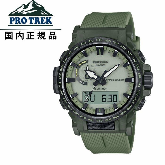 自然を愛する人の本格アウトドアギアPRO TREKから、全面蓄光ソーラー文字板を採用した「PRW-61LD」です。PRW-61LDは、夜間のアウトドアシーンでの実用性向上を目指し、全面蓄光文字板を搭載。光を透過するソーラー文字板でありながら蓄光を全面に施すことで様々なアウトドアシーンで活躍するモデルに仕上げました。インデックスやバンドには自然を感じさせるグリーンを取り入れ、アウトドアにふさわしいカラーリングとしています。ケースおよびバンドと樹脂製の裏蓋にはバイオマスプラスチックを採用し、環境への配慮を形にしました。さらに、トリプルセンサーを搭載し、方位、高度/気圧、温度を計測可能。加えて、マルチバンド6やタフソーラーなどの実用的な機能も備えています。夜間の視認性を高め、キャンプなどの様々なシーンに対応する高い機能性と実用性を詰め込んだモデルです。