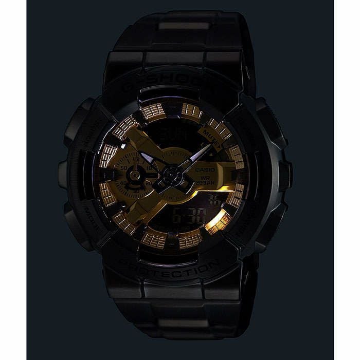 1983年の発売以来、究極の強さを求めて進化を続けるタフネスウオッチG-SHOCK。そのアイコニックなスタイルで人気モデルのひとつであるビッグケースのアナログ・デジタルコンビネーション、「110シリーズ」のベゼルとバンドを金属素材にアップデートしたGM-110です。