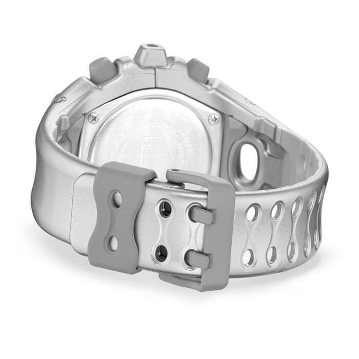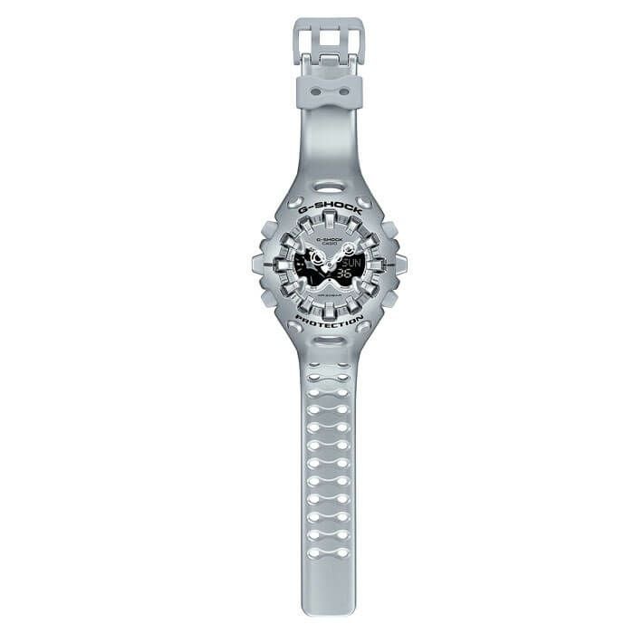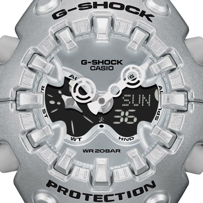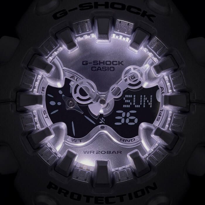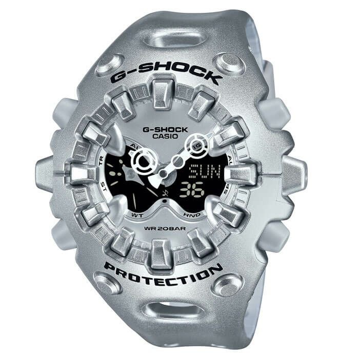 - ●アナログ・デジタルコンビネーションタイプのフェイスに、オープンワーク(透かしの部分をつくる技法)を施したダイアルとフルスクリーンLCDのレイヤー構造を採用。センターに異形タイプの時分針、液晶内に小針をレイアウトするなど、個性的なデザインに仕上げています。カラーは4色。シルバーのメタリックカラー、ブルーパープルやネオンイエロー、そしてG-SHOCKらしいブラックをラインアップしました。大容量電池の採用と低消費電力化により、アラームやライトなどの機能を搭載しながら電池寿命約10年を実現したモデルです。