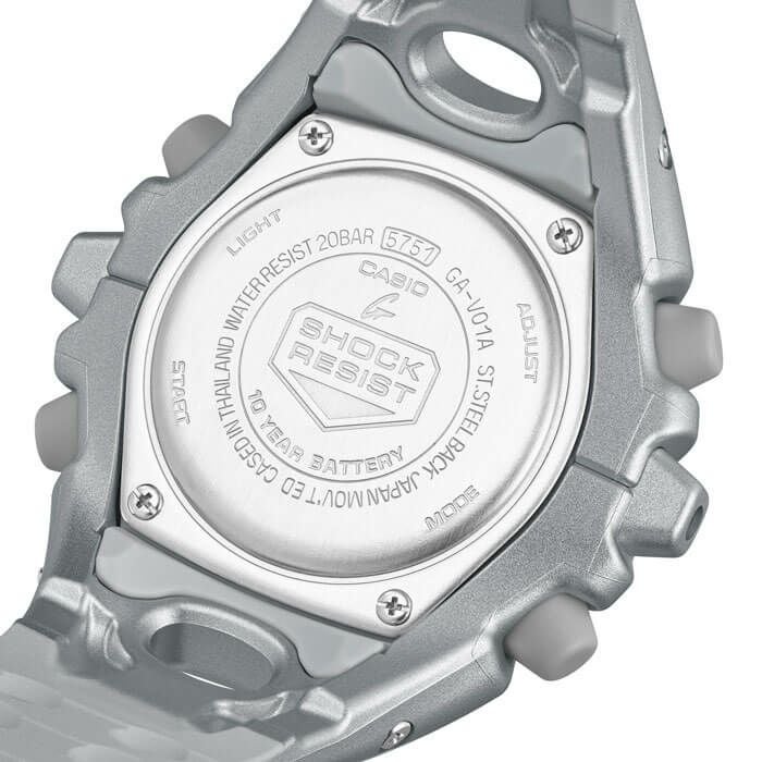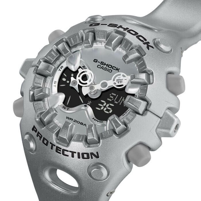 タフネスを追求し進化を続けるG-SHOCKから、構造とデザインにこだわったシリーズのご紹介です。エッジの効いたパーツを組み合わせた有機的な外装フォルム、2つの穴が大きな特徴となっている新開発のショックリリース針など、今までの常識を覆す斬新な発想で、強さを求めて挑戦を続けるG-SHOCKのアイデンティティを形にしました。モジュールを保護するセンターケースを、ベゼル・バンド一体構造の外装パーツでカバー。大型の立体インデックスをガラス上面に配置することで、衝撃を緩和するバンパーの役割を持たせました。G-SHOCK独自の耐衝撃性能をキープしながら、ユニークかつ力強い外装デザインを実現しています。衝撃の影響を受けやすい針をシャフトに固定せず、磁石の力で取り付けるマグネティックホールディング構造を開発しました。この構造で取り付けたショックリリース針(分針)は、磁力で固定されているため、受けた衝撃を受け流すことができます。本構造を採用することで、針の大型化やデザインの自由度を上げることが可能になりました。※ 磁力で固定される構造のため、衝撃や振動で分針が揺れることがあります。また、衝撃や振動が加わった直後、および強い磁気にさらされた際は、一時的に分針がずれる場合がありますが、数分以内に正しい位置に戻ります。