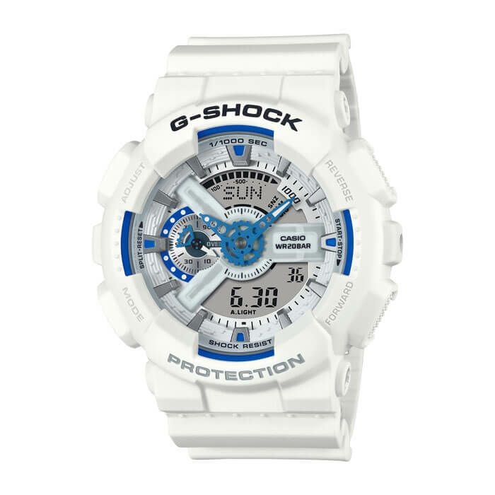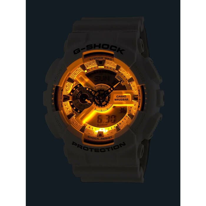 1983年の発売以来、飽くなき強さを求めて進化を続けるタフネスウオッチG-SHOCKから、人間の潜在能力を暗闇で光る蓄光パーツで表現した、HIDDEN GLOW SERIESです。夏の海をイメージしたホワイト&ブルーのカラーリング、夜光虫が放つ幻想的な光を表現したブルー蓄光フェイスを備え、昼と夜で異なる表情を見せるビーチの情景を表現しました。特徴的なダイアルデザインを採用した各モデルの個性を、色と光で引き立てます。カジュアルスタイルからワークスタイルまでアクセントになるクールなデザインです。
