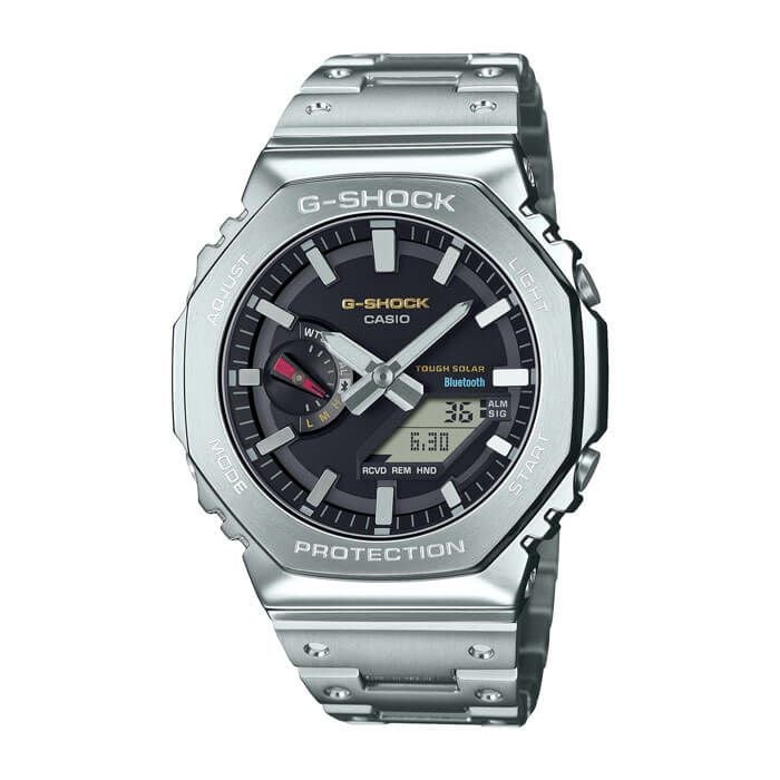1983年に誕生したG-SHOCK初代モデル“DW-5000C”のダイアルカラーを纏ったフルメタルモデルです。G-SHOCKのブランドカラーでもあり挑戦し続ける情熱を意味するレッド、高い防水性を表すブルー、ショックレジスタントを意味するイエローをあしらっています。ステンレススチール製のベゼルは、手間のかかる鍛造・切削・研磨加工を経て、立体的に成形し、天面をヘアライン、斜面をミラー研磨で美しく仕上げています。ステンレススチール製のケースは初代モデルと同じく、気密性に優れたスクリューバックケースを採用しています。フルメタルによる耐衝撃構造を実現するために、ベゼルとケースの間にはファインレジン製の緩衝材を実装。また、バンド接続部を3本足構造とし、連結パイプに加わる衝撃を分散。メタル製のバンドピースにディンプル加工を施し、初号機の樹脂バンドデザインを継承しました。製造も初代G-SHOCKを生み出したマザーファクトリー「 山 形カシオ 」で行 っています。