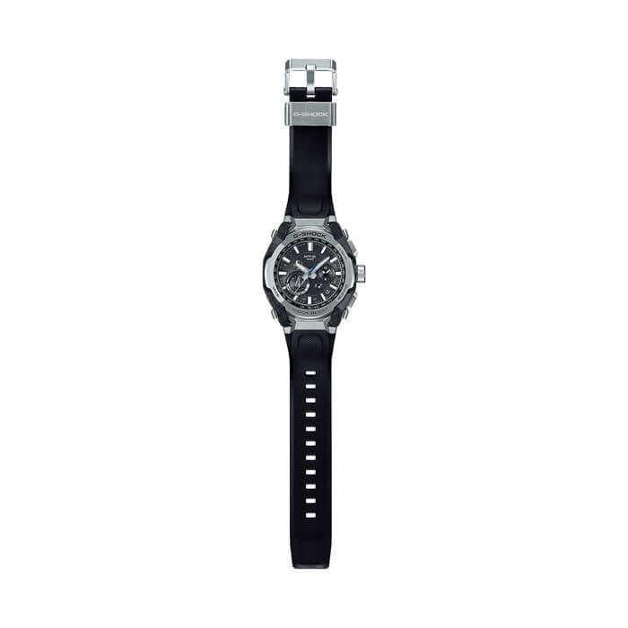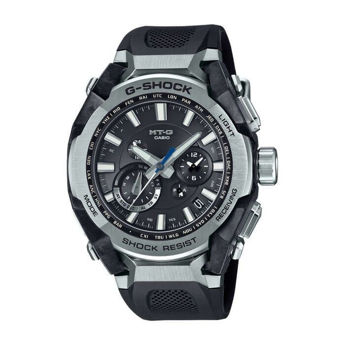 G-SHOCKの起源である樹脂素材とメタル素材を融合して、革新的な構造美を追求するMT-Gシリーズ。MTG-B4000は、蓄積された耐衝撃データを活用したAIによって開発された新しいデュアルコアガード構造と、カーボンとステンレススチールの異素材融合フレームを採用しています。これにより、強さと美しさを兼ね備えた革新的なデザインが実現しました。AIと人の共創により、素材、構造、造形が有機的に結合し、独創的な機能美を追求しています。AIを活用した開発プロセスでは、デザイナーのベース案の解析・シミュレーションの最適化をAIが行い、これを相互補完的に繰り返すことで機能性と美しさを両立させた形状を実現しました。カーボン積層フレームは、シート状のカーボンとグラスファイバーを積層した母材を立体状に削り出し、複雑造形のフレームを成形。ベゼルのステンレススチールパーツは内側と外側で2体ベゼルを採用。ヘアライン仕上げとミラー仕上げで部位ごとに磨き分け、美しく仕上げました。耐衝撃構造、耐遠心重力性能、耐振動構造をもつTRIPLE G RESISTも実現。裏蓋は、粉末状の金属を射出成形するMIM(メタルインジェクションモールディング)成形により立体的に成形され、ケースを保護しています。MTG-B4000B-1A2には、ベゼルなどのステンレススチールパーツに新開発のブルーグレーのIP加工を施しています。また、透明度の高いサファイアガラスを採用し、カシオ山形工場の微細加工技術による繊細なデザインが施されたダイアルなど、細部にまでこだわりました。機能面ではBluetoothR 通信機能により専用アプリ「CASIO WATCHES」と接続し時刻情報を取得。マルチバンド6やタフソーラー、高輝度なLEDライトも搭載し、実用的な機能を備えています。