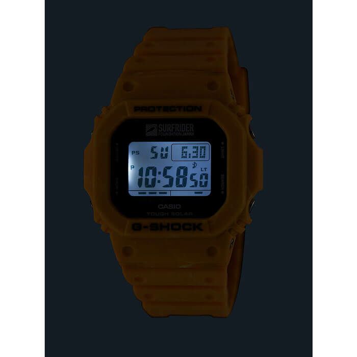 世界のトップサーファーをはじめ、エクストリーム系スポーツをサポートしているG-SHOCKと、海を愛するサーファーとともに環境保護活動を続ける「サーフライダーファウンデーションジャパン」とのコラボレーションモデルです。「サンライズサーフ」をテーマに、心地よい朝日を浴びて美しく輝くビーチの情景を、イエローとライトイエローのミックスカラーの混色成形で表現。環境負荷低減に貢献することが期待されている、バイオマスプラスチックやタフソーラーを採用しています。フェイス部と裏蓋にSURFRIDER FOUNDATION JAPANのロゴをあしらい、遊環に「#oceanfriendlylifestyle」のタグラインをプリント。海や自然との共生をいつも身近に感じられるデザインに仕上げました。※ 混色成形の特性上、色味や柄には個体差があります。※ 製品の特性上、素材表面に樹脂の凹凸形状が発生します。                                   【SURFRIDER FOUNDATION JAPAN】カリフォルニアのサーファー達が、自主的に始めたサーフポイントの水質調査活動。それがサーフライダーファウンデーションのルーツです。サーフライダーファウンデーションは、1984年にカリフォルニアで発足しました。日本では1993年から活動を開始、2011年に一般社団法人となりました。現在はアメリカを中心に、世界10ヵ国で活動している国際環境NGOです。