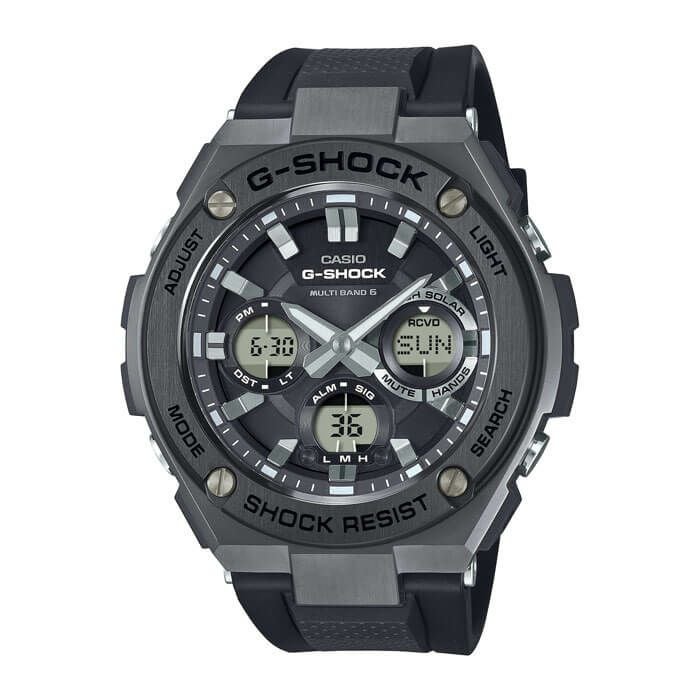 タフネスを追求し進化を続けるG-SHOCKから、「レイヤーガード構造」を採用したG-STEEL GST-W110MSのご紹介です。ブランドカラーであるブラックをテーマカラーに、ケース・ベゼルにIP処理を施し、精悍なデザインに仕上げました。さらにブラックの樹脂バンドを採用したGST-W110MS1AJFと、ホワイトの樹脂バンドを組み合わせたGSTW110MS-7AJFの2モデルをラインアップ。細部に至るまでブラックにこだわりながら、時分針にはホワイトをあしらい視認性の高い、シックでクールなモノトーンデザインに仕上げました。