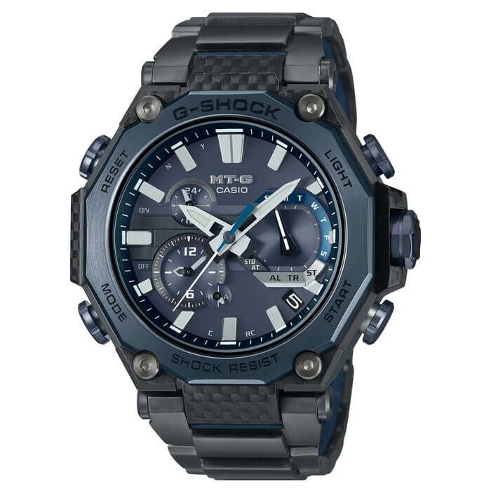 G-SHOCKの起源である樹脂素材とメタル素材を融合して、革新的な構造美を追求するMT-Gシリーズ。MTG-B2000は一体構造のカーボンモノコックケースでモジュールを保護し、外側をメタルパーツで覆った「デュアルコアガード構造」を採用して、軽量化と高い耐久性の両立をはかっています。ステンレススチールのトップベゼルやボタンなどには、ブルーグレーのIP加工を施し、ブラックとのバイカラーに仕上げました。時計側面のベゼルフレーム部にもカーボン素材を採用。カーボンファイバーシートとブルーのグラスファイバーシートを積層し熱プレスでプレート状の母材をつくり、そこから切削加工して成形します。ベゼルフレームの最上層の機密情報カーボンシートは、3時、6時、9時、12時位置で側面に回り込むように重ね強化し、ラグ部分は筒状にカーボンシートを巻き付けることにより耐久性をさらに向上しています。また、透明度の高いサファイアガラスを採用し、カシオ山形工場の微細加工技術による繊細なデザインが施されたダ イ ア ル に よ り 、全 体 の 質 感 も 高 め て い ま す。 加 えてバ ンド 交 換も可 能な「 レイヤーコンポジットバンド 」を採 用し、メタルの質感を向上しつつ軽量化に成功しました。機能面ではBluetoothR 通信機能により専用アプリ「CASIO WATCHES」と接続し時刻情報を取得。マルチバンド6やタフソーラー、高輝度なLEDライトも搭載し、実用的な機能を備えています。