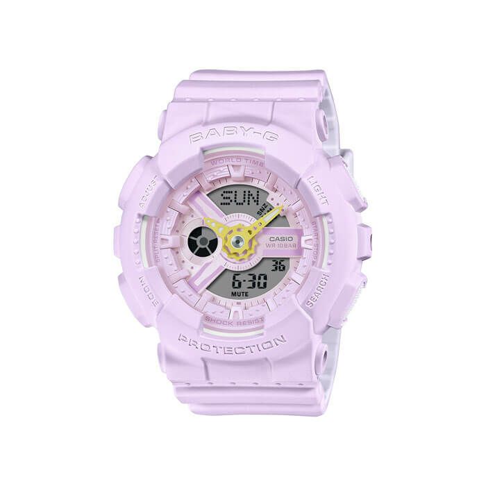 アクティブな女性に向けた耐衝撃・カジュアルウオッチBABY-Gから、柔らかなソフトカラーを纏ったデザインで、日常に彩りを添えるモデルです。ベースモデルには、文字板やインデックスなど様々なパーツを複雑に組み合わせたデザインが特徴のBA-110を採用。柔らかなパステル調のカラーを纏ったモデルに、針の色には鮮やかなポップカラーの差し色を施しました。遊び心あるカラーコントラストが気分を明るく盛り上げます。耐衝撃構造や10気圧防水機能など、日常のアクティブシーンに欠かせない頼れる機能も充実。日常生活はもちろん、スポーツやレジャーシーンも安心。アクティブな毎日を応援します。