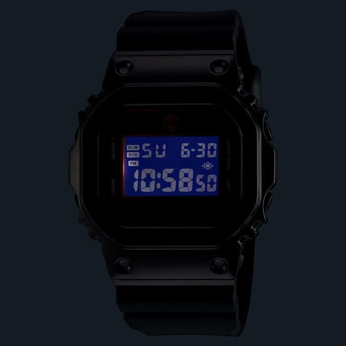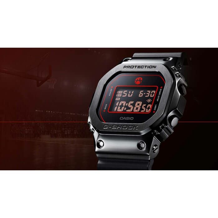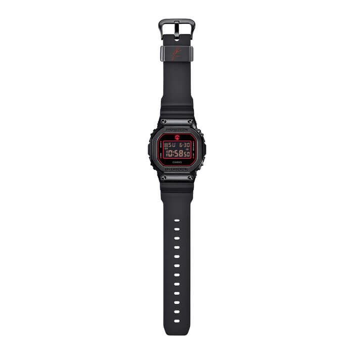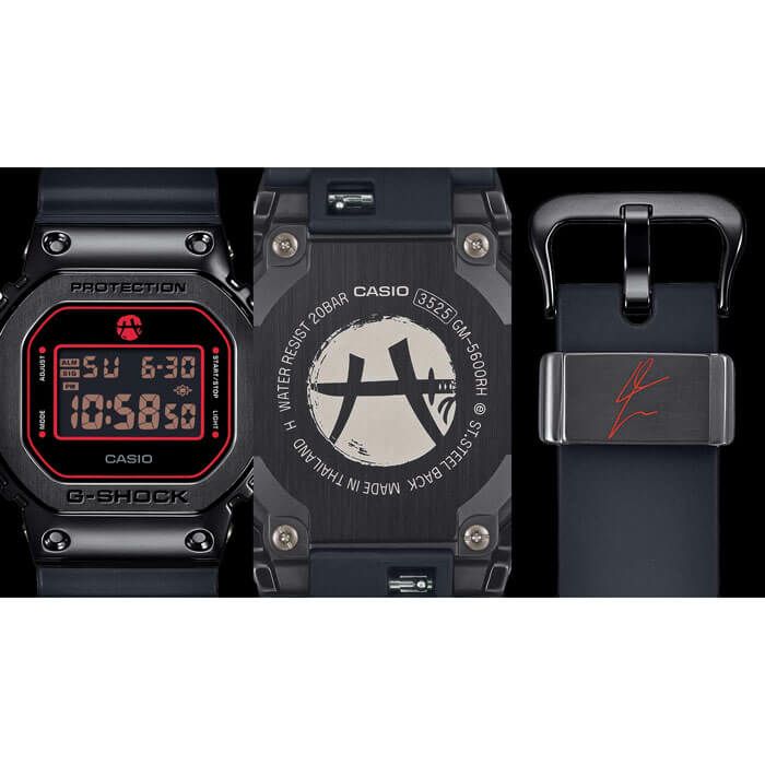 NBAプロバスケットボールプレーヤー八村塁選手とのシグネチャーモデルの第5弾です。メタルベゼルが特徴のGM-5600をベースモデルに採用し、力強いブラックを基調に、情熱的なレッドのアクセントカラーをあしらいました。漢字の「八」と刀を組み合わせHachimuraの「H」をシンボル化した、通称ブラックサムライと呼ばれるオリジナルロゴをフェイス上部と裏蓋にレイアウト。遊環には八村選手のサインを刻印しました。オールブラックに映える鮮やかなレッドのアクセント。G-SHOCKのブランドカラーで、高みを目指して挑戦を続ける八村選手の強さと情熱を表現しました。ベゼルをはじめとしたメタルパーツにIP処理を施し、質感を高めています。随所に八村選手のオリジナルロゴやサインを配したスペシャルモデルです。バンドの主な樹脂パーツには、環境負荷低減への貢献が期待されるバイオマスプラスチックを使用しました。