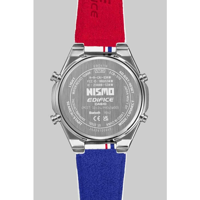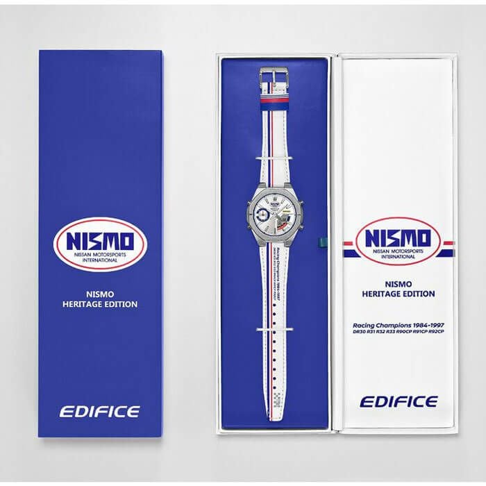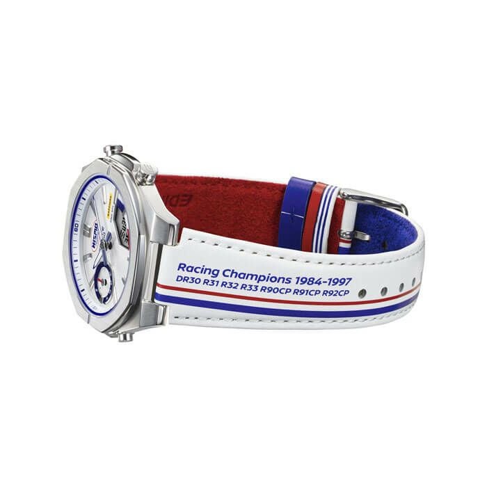 EDIFICE NISMOヘリテージエディションは、NISMOのレース魂をそのまま腕時計に刻み込んだ特別なモデルです。日産自動車とNISMOの監修のもとに企画されたこの時計は、1984年のNISMO設立から続く栄光へのリスペクトを表現しています。NISMOファンにとって、この時計は単なるアクセサリーではなく、身に着けられるNISMOの歴史と情熱です。デザインには、初代NISMOロゴが採用されており、日産ワークスチームのカラーであったトリコロールカラーがダイアルやバンドに鮮やかに映し出されています。バンドの裏側にも青と赤のトリコロールが施され、遊環には初期ユニフォームのストライプが再現されています。文字板上部の蓄光ロゴは、夜間も走行する24時間レースのグループCレース車両の蓄光カーナンバーを思わせます。さらに、1984年から1997年までの間にシリーズチャンピオンを獲得した名車への敬意を込めて、バンドにはその名車の型式が印刷されています。 富士1000kmレースで活躍したNISSANR92CPの鯉のぼりデザインや、R32スカイラインの「ハチマキ 」をイメージしたオレンジの帯も取り入れ、細部にまでこだわり抜いたデザインが魅力です。機能面では、BluetoothRによるスマートフォンリンクを搭載し、時刻の正確な調整やアプリによる操作が可能です。忙しいレースイベントでも信頼できる正確なパートナーとして活躍します。9.6mmの薄型ケースは装着感が軽く、サファイアガラスと10気圧防水で耐久性も兼ね備えています。EDIFICE NISMOヘリテージエディションは、NISMOファンの心に響く究極の時計です。あなたの腕元で、その栄光と情熱を感じてください
