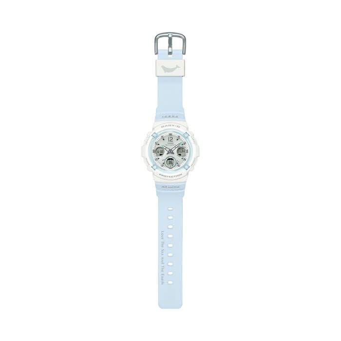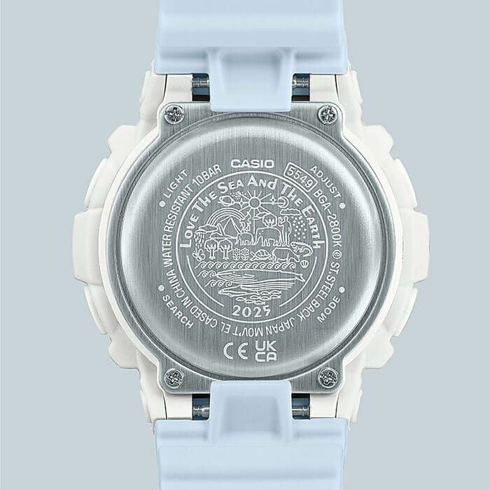 G-SHOCKとBABY-Gは、90年代後半より様々な環境団体とコラボレーションモデルを制作し、サポートを続けています。「Love The Sea And The Earth」というテーマのもと、イルカ・クジラを通じて自然の素晴らしさを伝える活動に取り組む「ICERC Japan」をサポートしています。2025年のテーマは、「ザトウクジラ」と「スナメリ」。ホワイトとブルーのコントラストカラーをあしらい、それぞれが泳ぐ遠洋と近海のイメージを、濃淡の異なるブルーで表現しました。 BABY-Gは、丸い頭と愛らしい表情が魅力の「スナメリ」をデザインモチーフに採用。体色をイメージしたホワ