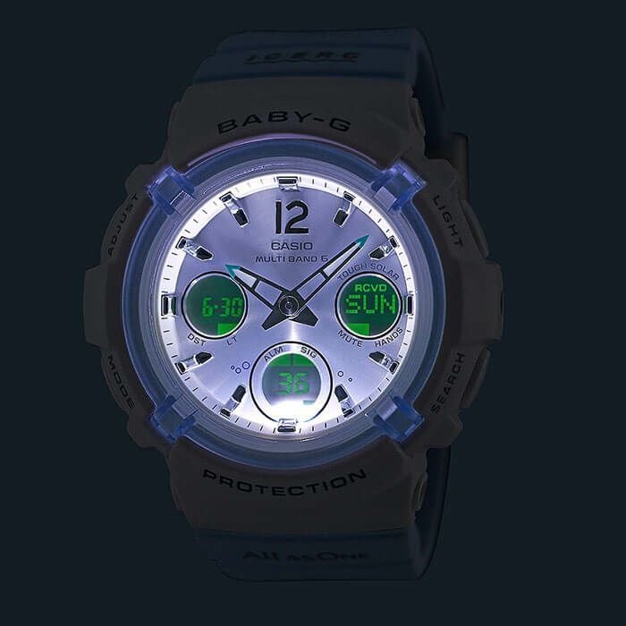 ●ダブル LED ライト:文字板用 LED ライト(フルオートライト、スーパーイルミネーター、残照機能、残照時間切替(1.5 秒 /3 秒)付き)、LCD 部用 LED バックライト(フルオートライト、スーパーイルミネーター、残照機能、残照時間切替(1.5 秒 /3 秒)付き