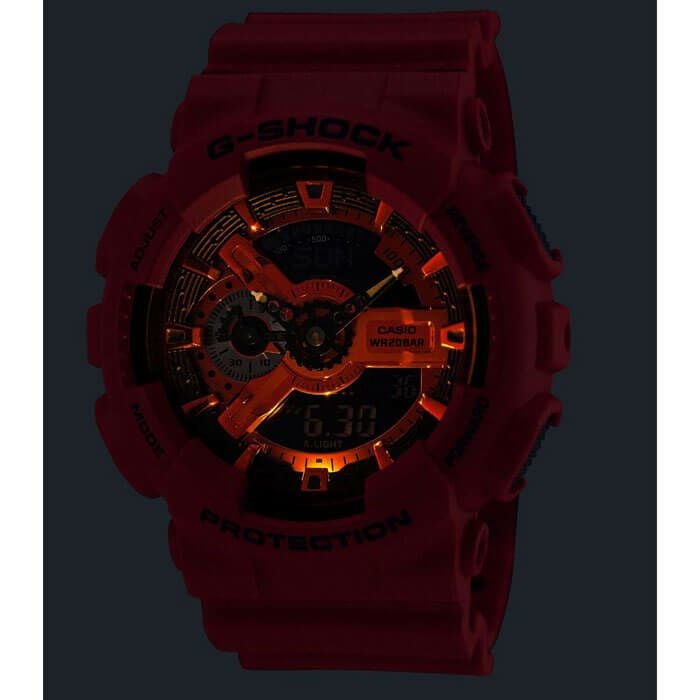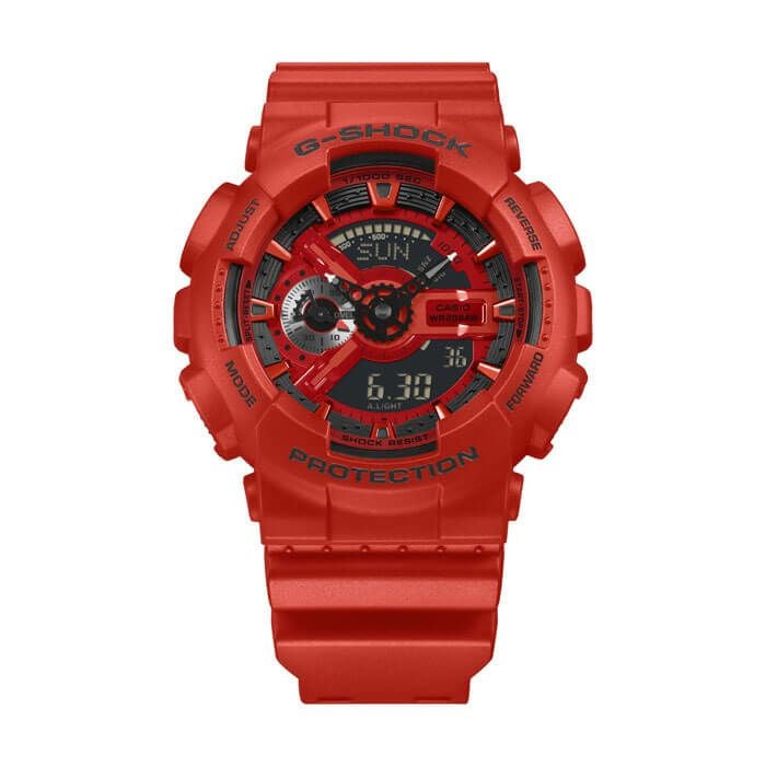 時代と共に進化し続け、世界中のファッショニスタやアスリートに愛されているG-SHOCKから、ブランドカラーである赤にこだわったIconic Stylesのモデルをご紹介します。・110 Style:異彩を放つビッグサイズモデル。時計のフェイスに施された赤の色合いがバンドやベゼルと調和し、力強く質感のコントラストが印象的なデザインに仕上がっています。液晶には反転液晶を採用し、各所にブラックカラーを取り入れることでデザイン性を高めています。ブラックのアクセントカラーが赤を引き立て、強さとインパクトを与え、G-SHOCKのアイデンティティを表現しています。ストリートファッションにも最適で、カジュアルなスタイリングのアクセントとして活用しやすいモデルです。