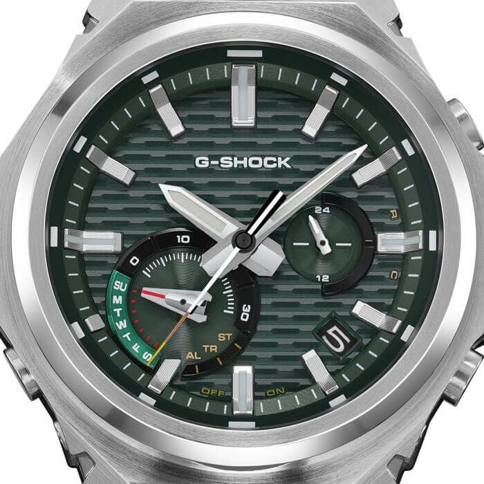 G-SHOCKが長年培ってきたタフネス構造と、機能美に根ざしたデザイン思考を受け継ぎ、それを研ぎ澄まされたミニマルな表現で再構築した新たなスタイル、SLEEKSTYLE(スリークスタイル )のモデルです。ロゴを排してクリーンな印象に仕上げたベゼルは、縦のヘアライン、円系のヘアライン、ミラー 仕上げの3種で磨き分けられ、光の角度で表情を変え、豊かな質感を演出します。GST-B1000のために開発されたステンレススチール製のバンドには、ヘアライン仕上げとミラー仕上げを施しています。新開発の三つ折れ式中留は、端正なデザインとホールドが魅力。控えめな佇まいが、腕元に上質な空気を纏います。G-SHOCK初号機“DW-5000C”から継承したベゼルデザインやレンガパターンが、ドレッシーな装いの中にスポーティさを加えています。GST-B1000D-1AJFには、同じく初号機から継承した、挑戦する情熱を意味するレッド、防水性を表すブルー、ショックレジスタントを意味するイエローをアクセントカラーに採用。構造面では、メタルベゼルが外部からの衝撃をガードし、カーボンファイバー強化樹脂製のケースがモジュールを保護しています。また、メタルバンドの接続部分にはウレタン樹脂製の緩衝パーツを採用することで、バンド接合部に加わる衝撃を吸収し、メタルバンドの連結強度を高めています。さらに、ガラス接着方式や小型モジュールを採用することで、耐衝撃構造を実現しつつ、厚みや重量を削減。快適な着け心地と実用性を両立しています。コンパクトなサイズ感とミニマルなデザインは、ビジネスからカジュアル、アウトドアまで自在に対応。一つの時計で多くの瞬間に対応できる「オールラウンド・タイムピース」として活躍します。