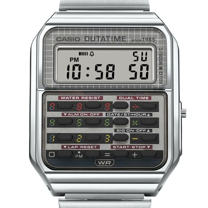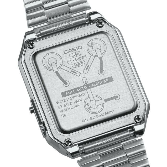 CASIO CLASSICと2025年に公開40周年を迎える名作映画『バック・トゥ・ザ・フューチャー』との夢のコラボレーションが実現しました。時代を超えて愛されるCASIO CLASSICと、未来への冒険を描いた映画が、特別な1本として腕時計に表現されています。ベースモデルには1980年代から続くカシオウオッチのロングセラーCALCULATORモデルCA-500を採用。作品を象徴するデロリアンのモチーフをフェイスに採用し、映画の世界観を色鮮やかに表現。さらに、デロリアンで行き先の時間を設定するための装置「タイムサーキット 」をイメージしたマルチカラーがボタン周りに施され、見るたびに未来への旅を感じさせてくれます。裏蓋には劇中でタイムトラベルの要となる装置 「フラックス・キャパシター」の刻印が施されています。これは、デロリアンをタイムマシンとして機能させるために不可欠なパーツで、シリーズを象徴する重要なモチーフです。中留には『バック・トゥ・ザ・フューチャー』のロゴがあしらわれ、細部までこだわったデザインが魅力。シルー