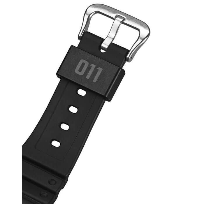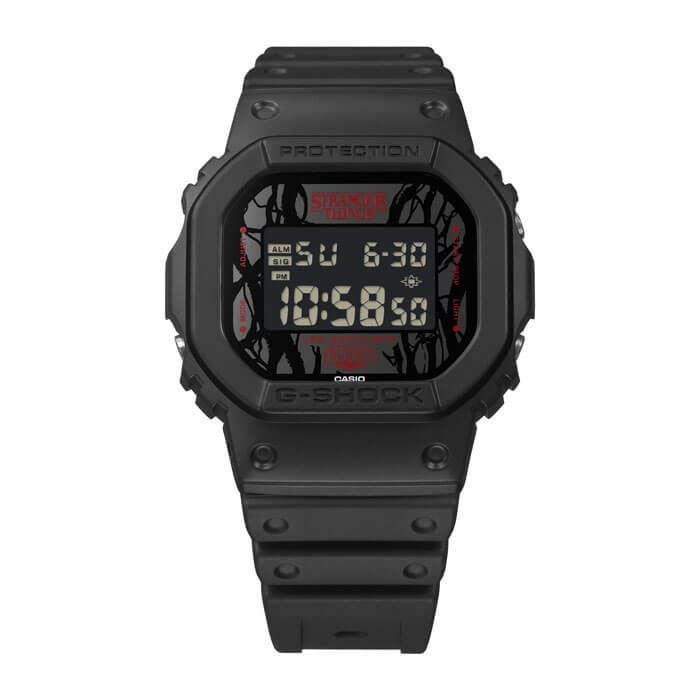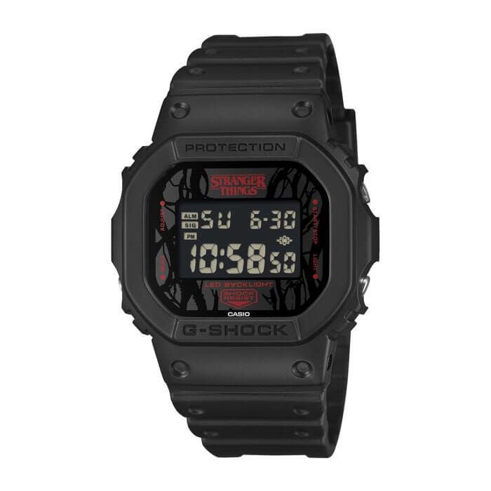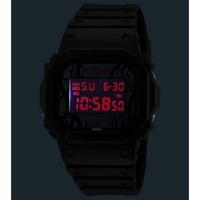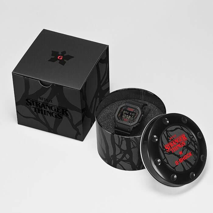 11月に最終章となるシーズン5を迎えるNetflixシリーズ「ストレンジャー・シングス 未知の世界」とのスペシャルコラボレーションモデルです。ベースモデルはDW-5600を採用。ストレンジャー・シングスを象徴する表と裏の2つの世界「UPSIDEDOWN」をテーマに、随所にその世界観を表現しています。ダイアルにはシリーズ中の強敵であるヴェクナを象徴するVINESをデザインに落とし込んでいます。「LED BACKLIGHT」のAを反転表記することで表と裏の世界を表現し、バックライトは作品のイメージカラーである赤色で点灯します。裏蓋にストレンジャー・シングスのロゴを刻印し、遊環にはメインキャラクターであるイレブンの数字表記である「011」をプリントしています。シリーズを通して主人公達が対峙するデモゴルゴンとVINESを落とし込んだ専用のパッケージを採用し、ファイナルシーズンであるシーズン5の公開に合わせた特別なコラボレーションモデルです。