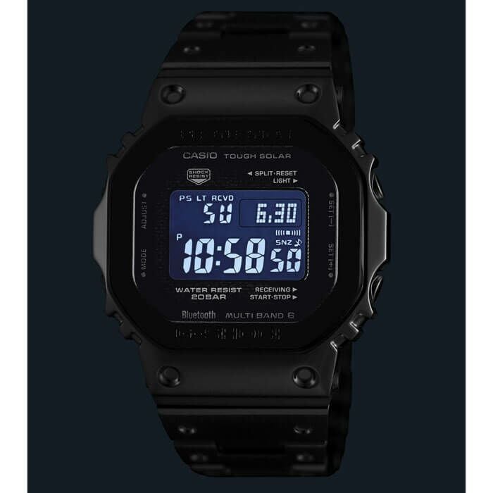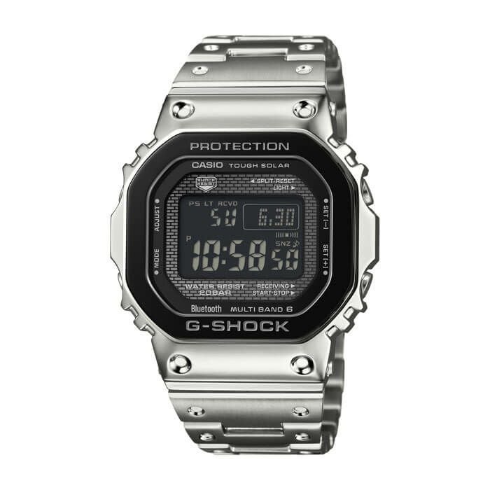 G-SHOCK初代モデル“DW-5000C”の八角形フォルムを受け継ぐGMW-B5000・GM-B2100・GMC-B2100から、その象徴的な八角形トップベゼルにブラックを採用したモデルです。シルバーの中に際立つブラックがG-SHOCKの象徴的な強さを強調しつつ、幅広いスタイルに合わせやすいモノトーンデザインとなっています。GMW-B5000BTはトップベゼルをミラー仕上げとし、ガラスの一部にシルバー 蒸着を施すことで、タフなスタイルの中に精巧な輝きを加えています。ステンレススチール製のベゼルは、鍛造・切削・研磨といった手間のかかる加工を経て立体的に成形し、美しく仕上げています。フルメタルによる耐衝撃構造を実現するため、ベゼルとケースの間にはファインレジン性の緩衝材を実装。また、メタル製のバンドピースにはディンプル加工を施し、G-SHOCK初号機の樹脂バンドデザインを継承しています。製造は初代G-SHOCKを生み出したマザーファクトリー「山形カシオ」で行われています。さらに、GMW-B5000BTのステンレススチール製ケースは、気密性に優れたスクリューバックケースを採用しています。
