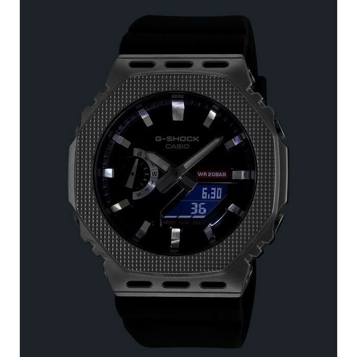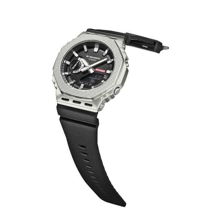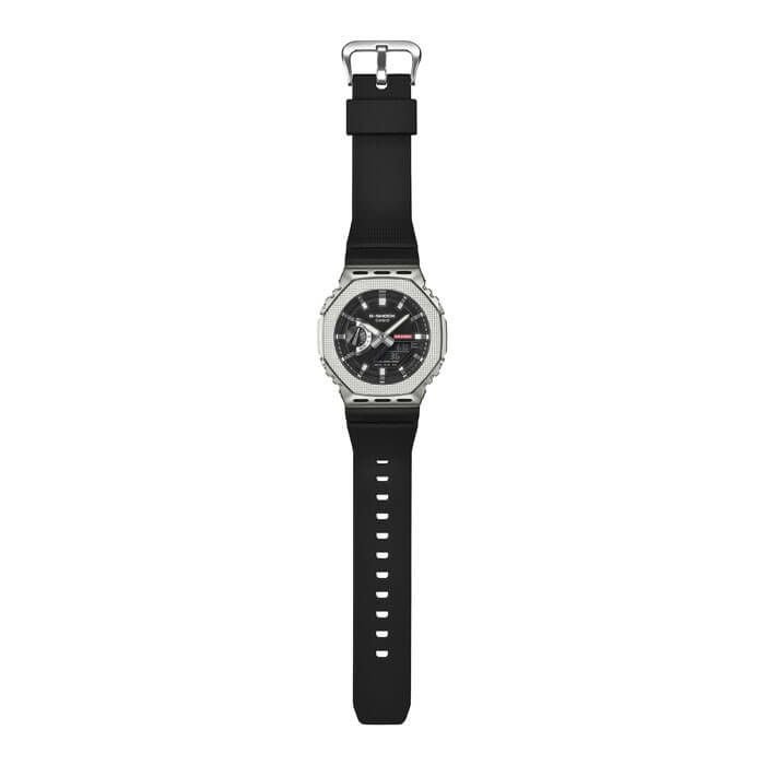 タフネスを追求し進化を続けるG-SHOCKから、モダンなインダストリアルデザインをテーマに機能美を追求し、G-SHOCKの耐衝撃性の要素をシンプルにデザインに落とし込んだモデルです。ベースモデルには、メタルベゼルを採用したアナログ・デジタルコンビネーションモデルGM-2100を使用しています。シンプルさと機能美の共存を目指し、無彩色のカラースキームを採用。G-SHOCKの耐衝撃性を象徴するメタルの八角形ベゼルには、モダンインダストリアルデザインでも多く見られるチェッカリングパターンを施し、メタルベゼルや、機能表示をマーキングした赤いアクセントカラーが、機能性を豊かに表現しています。ベゼルの切削穴からは、耐衝撃構造を実現するためにモジュールを保護しているガラスファイバー強化樹脂製のセンターケースが見え、耐衝撃構造を視覚的に表現しています。GM-2100BMでは、ベゼルの天面以外のパーツにブラックIPを施すことでベゼルのフォルムに奥行きと引き締まった印象を与え、シックな佇まいに仕上げています。