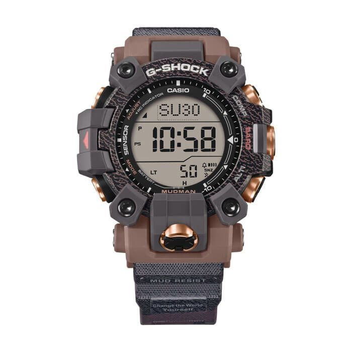 G-SHOCK/BABY-Gは、90年代後半より様 々な環境団体とのコラボレーションモデルを制作し、団体のサポートを続けています。2025年も「Love The Sea And The Earth」というテーマのもと、絶滅の危機にある生態系、海洋・生物の多様性、気候変動など多岐にわたる環境保全、研究を支援している「EARTHWATCH Japan」をサポートします。今 回 のモデルには、マッドレジスト 構 造を 搭 載したMASTER OF GシリーズのMUDMAN(マッドマン )を採用。開発や気候変動による生息地の消失、密猟によって絶滅が危惧されている「カバ*」をモチーフにデザインしました。分厚くざらざらしたカバの皮膚を、ベゼル・バンドにダイナミックにデザイン。陸生哺乳類として世界で3番目に大きく、タフなカバを連想させます。ボタンにもカバをイメージし、ローズゴールドIPを施しています。EARTHWATCH Japanの 呼 びかけの 言 葉 である「Change the World. Yourself.」をバンドに、ロゴマークを遊環に印刷。LEDバックライトにもロゴが浮かび上がり、裏蓋には「Love The Sea And The Earth」のシンボルマークを刻印するなど、随所に細やかなデザインが施されています。