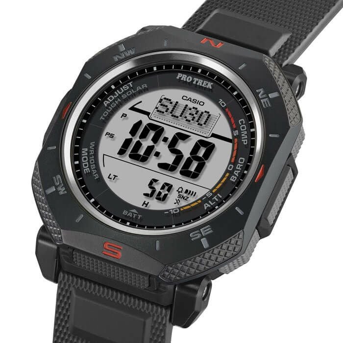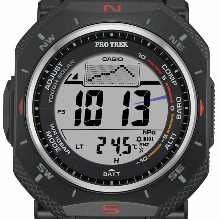 自然を愛する人に向けた本格アウトドアギアPRO TREKから、ソーラー搭載モデル「Climber Line PRG-69」です。PRO TREKデジタルライン初の角型ケースを採用した革新的なClimberLinePRG-69。無骨なアウトドアギアをイメージした角型デザインは、従来の丸型ケースとは一線を画す新しいPRO TREKの表情を演出します。コンパクトサイズでありながら、存在感のあるフォルムが軽装備でのアウトドア活動にマッチします。