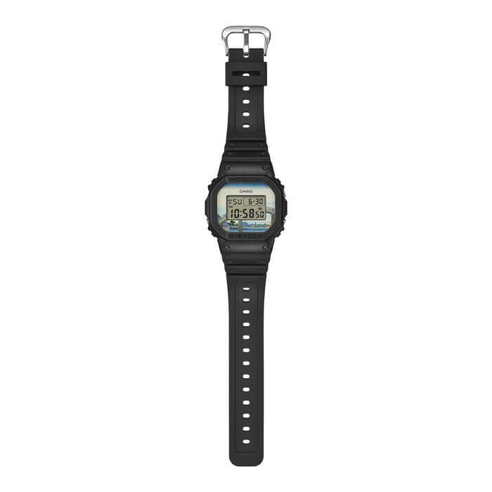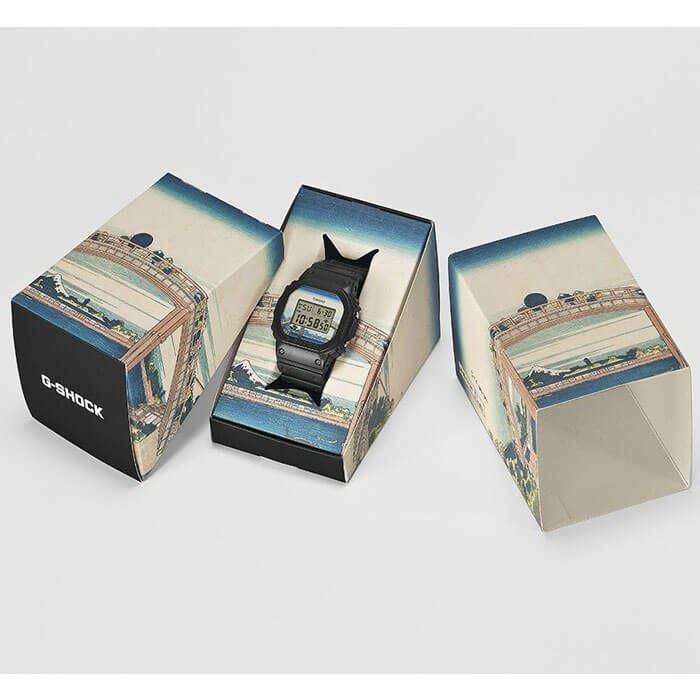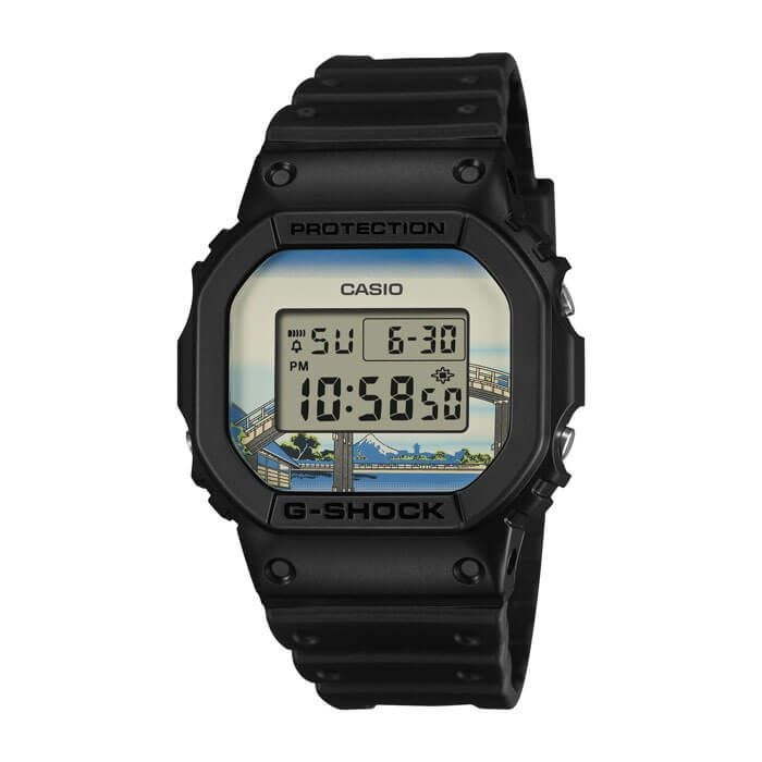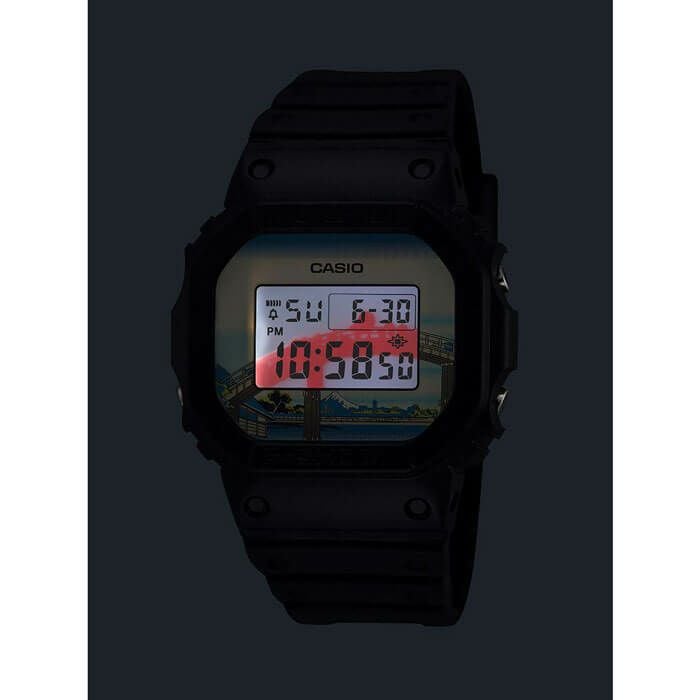 1983年の発売以来、飽くなき強さを求めて進化を続けるタフネスウオッチG-SHOCKから、江戸時代に活躍し国内外で広く知られている浮世絵画家、葛飾北斎の人気作品をデザインモチーフにしたモデルです。北斎の代表作である富嶽三十六景の中から「深川万年橋下」を採用しました。ベースモデルにはアイコニックな定番デジタルDW-5600を採用し、文字板には「深川万年橋下」を大胆にデザイン。LEDバックライト点灯時には文字板と一体となって深川万年橋の曲線美を表現します。裏蓋には漢字で“日本”という文字を刻印しました。また、日本で誕生した浮世絵にちなみ、made in Japanと生産地にもこだわりました。グローバルにアピールすべく、パッケージにもこだわり特別仕様になっています。