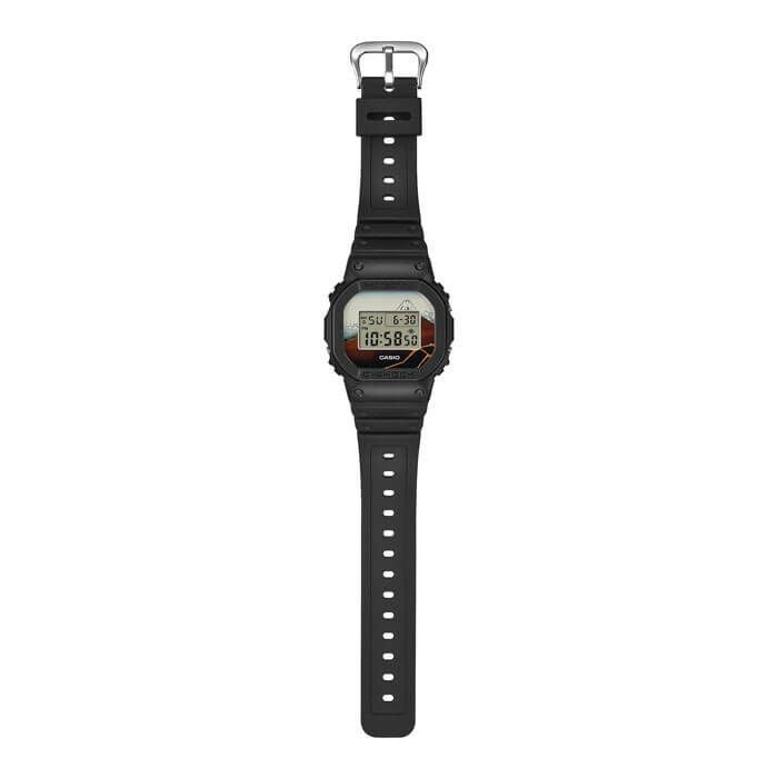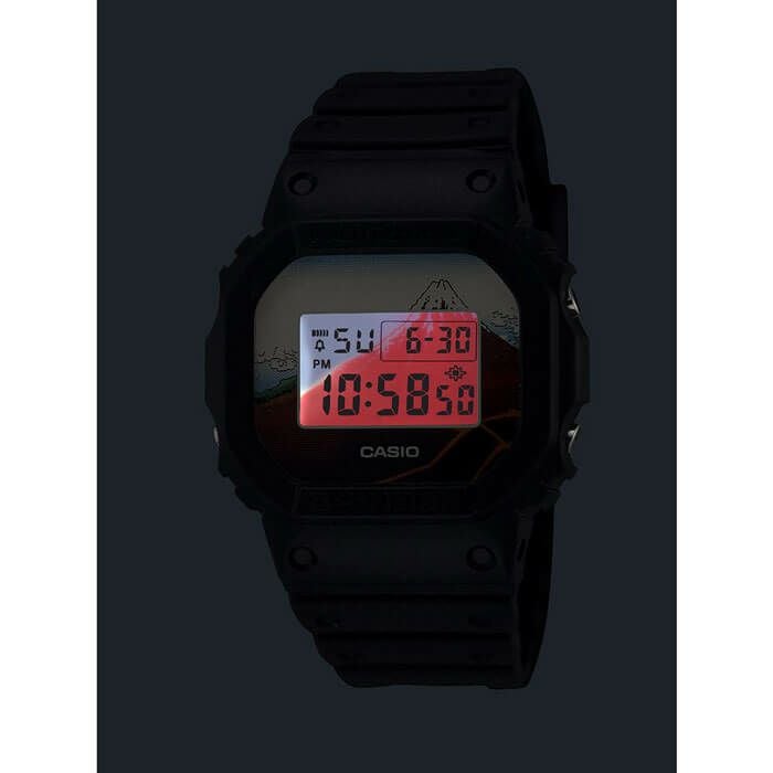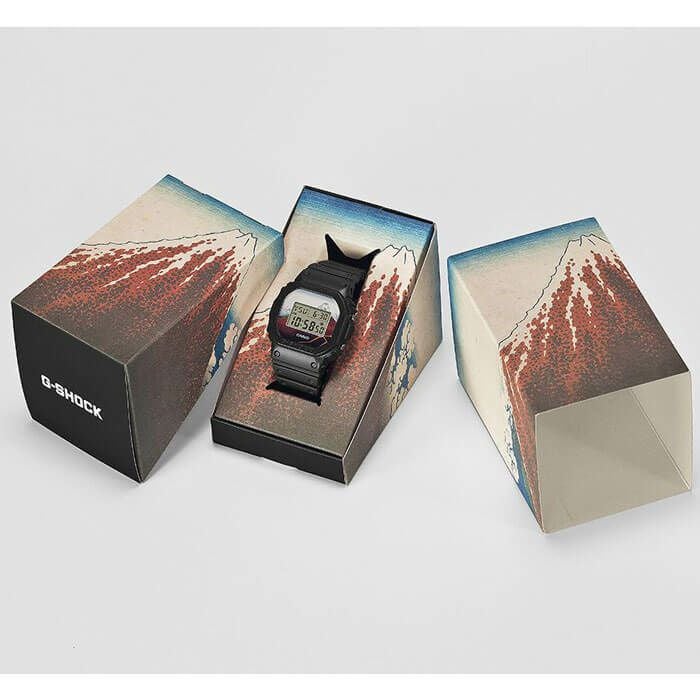1983年の発売以来、飽くなき強さを求めて進化を続けるタフネスウオッチG-SHOCKから、江戸時代に活躍し国内外で広く知られている浮世絵画家、葛飾北斎の人気作品をデザインモチーフにしたモデルです。北斎の代表作である富嶽三十六景の中から「山下白雨」を採用しました。ベースモデルにはアイコニックな定番デジタルDW-5600を採用し、文字板には「山下白雨」を大胆にデザイン。LEDバックライト点灯時には文字板と一体となって同作品の雄大さを表現します。裏蓋には漢字で“日本”という文字を刻印しました。また、日本で誕生した浮世絵にちなみ、made in Japanと