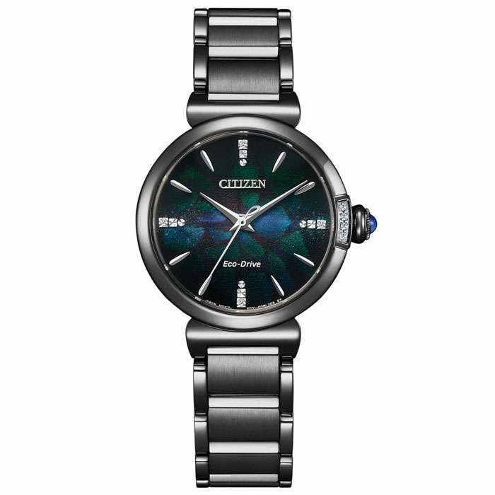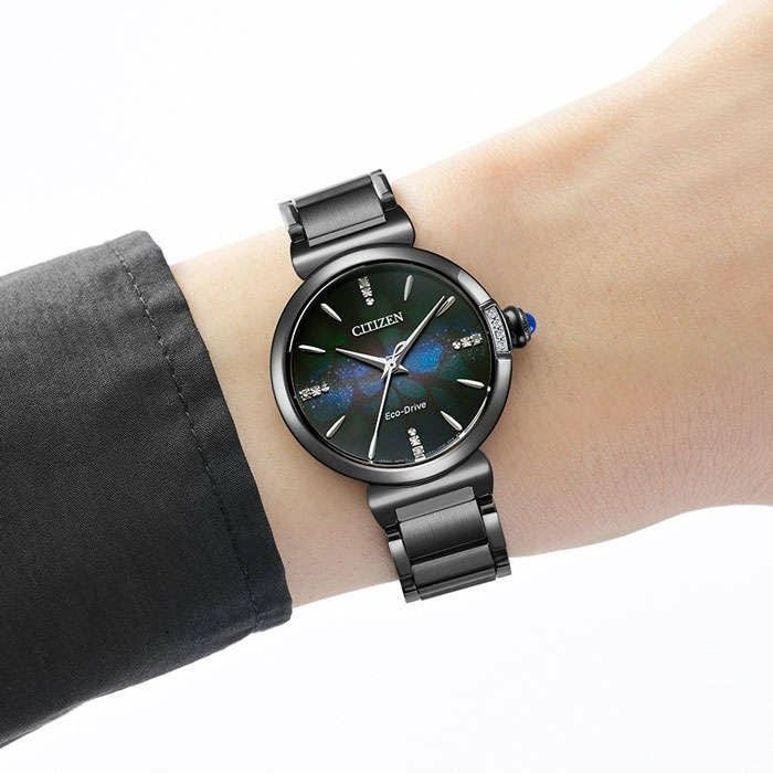 人気のラウンドコレクションのケースをベースに、ブラックカラーと神秘的なブルーグリーンを組み合わせた、今までのシチズン エルにはないモダンでエレガントなモデル。