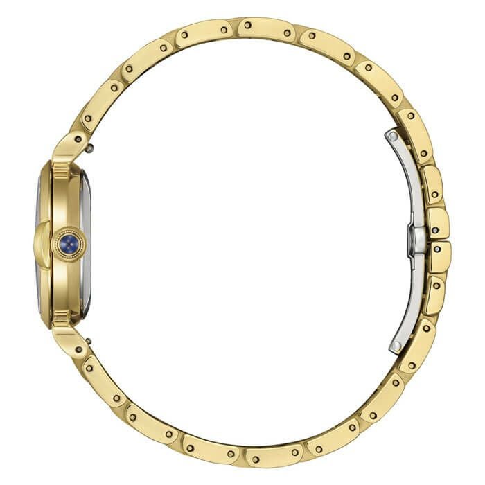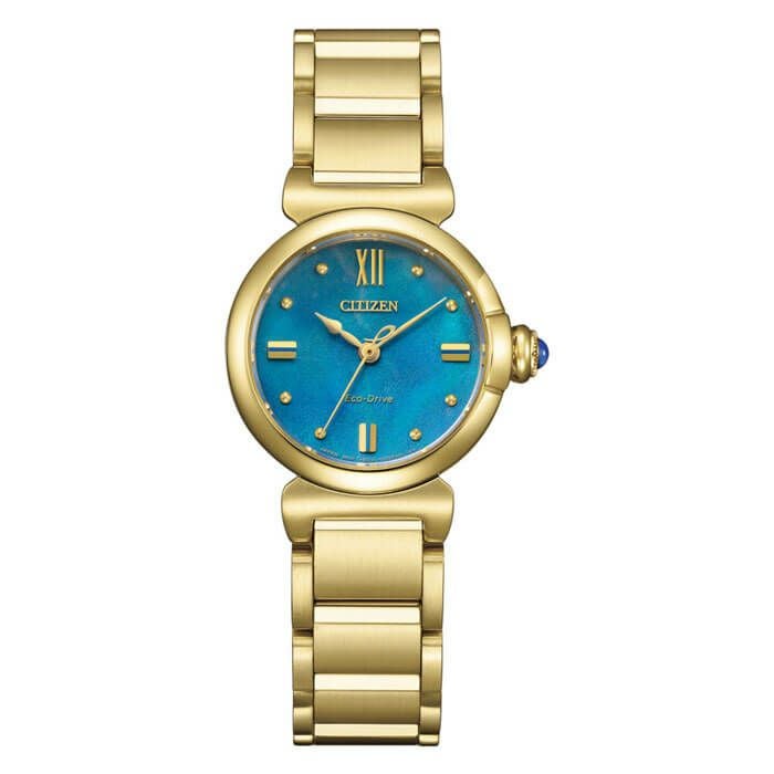 アンティーク風のテイストを生かしたライトゴールドのケース、太陽のもとで揺らめく海面を思わせるブルーの文字板。