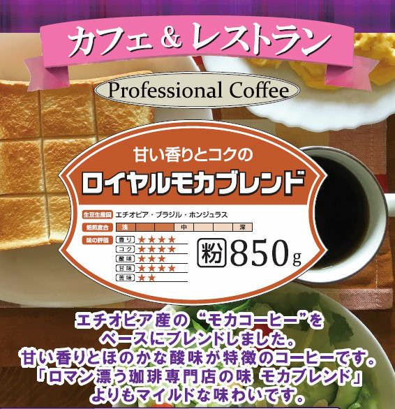 エチオピア産モカコーヒーをベースにブレンドしました。甘い香りとほのかな酸味が特徴のコーヒーです。「ロマン漂う珈琲専門店の味 モカブレンド」よりもマイルドな味わいです。
