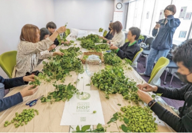栽培過程では大学生の研究活動を支援し、土づくりや栽培技術向上に関する実践的な学びの場を提供。さらに地域の皆様と共にホップの収穫体験会を実施することで、都市における農的活動の魅力や地元産ビールの可能性を共有しています。