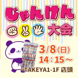 ■開催場所:TAKEYA1-1F店頭(雨天の場合はTAKEYA1-2Fテラス) じゃんけんで勝ち残った方には「うまい棒30本」プレゼント!負けても参加賞がもらえるよ~参加は無料。 大人もお子様もどなたでも参加できます。た […]