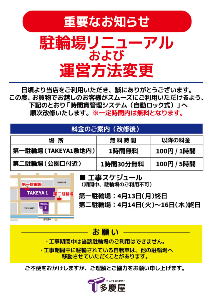 | 第一駐輪場(TAKEYA1敷地内) | 1時間無料 | 100円 / 1時間 |