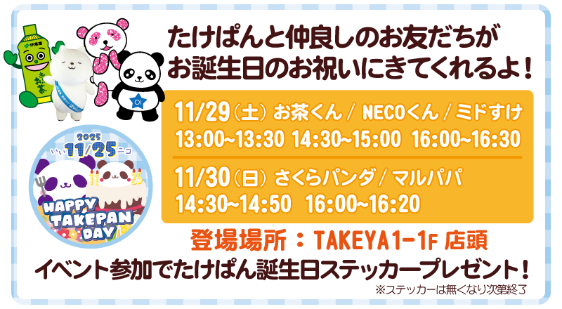 11月25日は多慶屋の公式キャラクター「たけぱん」の誕生日!11月中旬から11月末まで、たけぱんをお祝いするために様々なイベントを実施いたします。ぜひみなさんも一緒にたけぱんのお誕生日をお祝いしましょ~