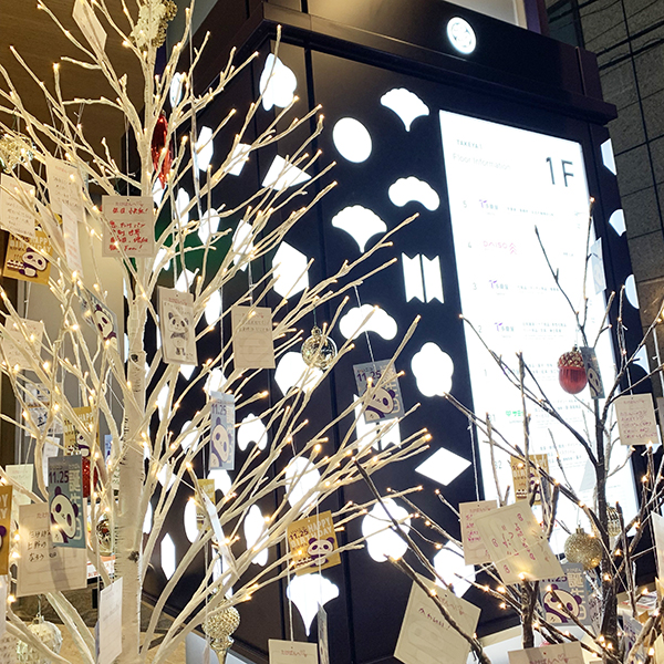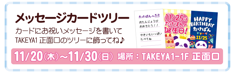 カードにたけぱんへのお祝いメッセージを書いて、TAKEYA1正面口のツリーに飾ってね♪